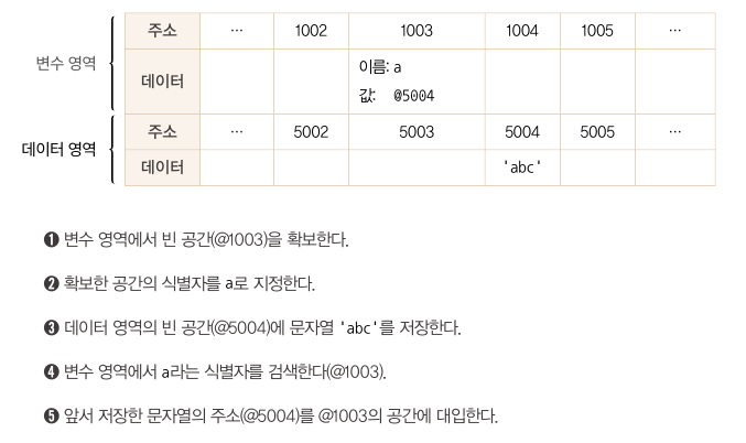 만약 미리 확보한 공간 내에서만 데이터 변환을 할 수 있다면 변환한 데이터를 다시 저장하기 위해 확보된 공간을 다시 늘리는 작업이 선행돼야 한다. 이러다 보면 컴퓨터가 처리해야 할 연산이 많아지기 때문에 가장 효율적인 방법은 문자열 데이터의 변환을 처리하기 위해 변수와 데이터를 별도의 공간에 나누어 저장하는 것이다.