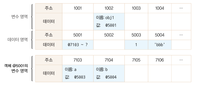 기본형 데이터와의 차이는 '객체의 변수(프로퍼티) 영역'이 별도로 존재한다는 점이다.