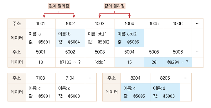 그림을 자세히 보면 객체가 별도로 할애한 영역은 변수 영역일 뿐 '데이터 영역'은 기존의 메모리 공간을 그대로 활용하고 있다. 데이터 영역에 저장된 값은 모두 불변값이다. 그러나 변수에는 다른 값을 얼마든지 대입할 수 있다. 바로 이 부분 때문에 참조형 데이터는 불변하지 않다(가변값이다)라고 하는 것이다.