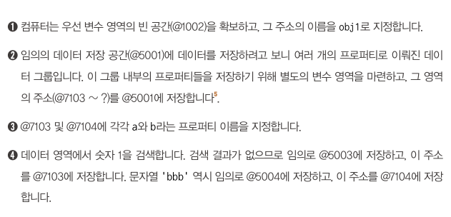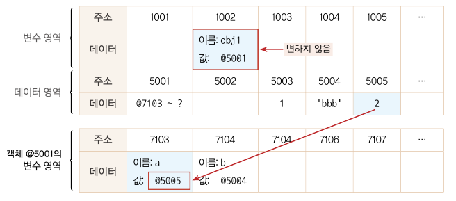 obj1의 a 프로퍼티에 숫자 2를 할당한다고 하면 데이터 영역에서 숫자 2를 검색한다. 결과가 없으므로 빈 공간인 @5005에 저장하고, 이 주소를 @7103에 저장한다. 변수 obj1이 바라보고 있는 주소는 @5001로 변하지 않는다. 즉 '새로운 객체'가 만들어진 것이 아니라 기존의 객체 내부의 값만 바뀐 것이다.