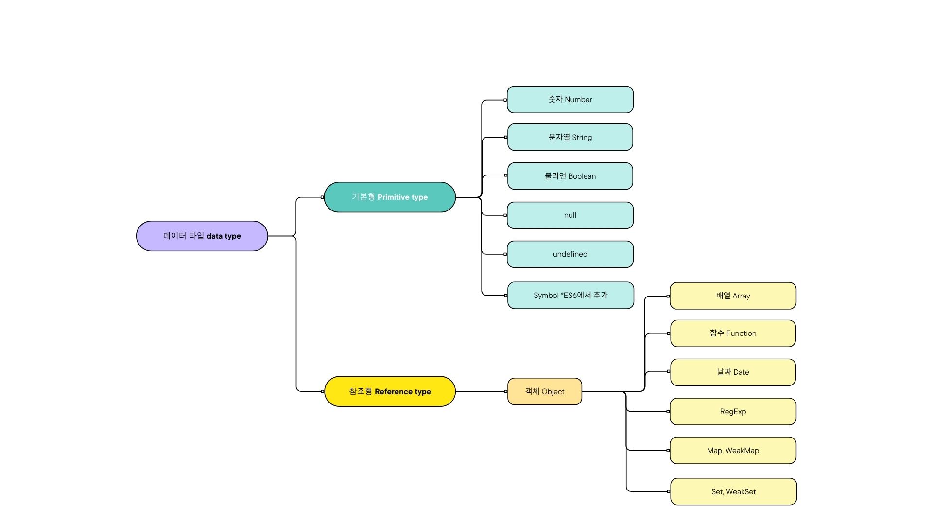 - '없음'을 나타내는 값은 두 가지가 있는데, undefined는 어떤 변수에 값이 존재하지 않을 경우이고 null은 사용자가 명시적으로 '없음'을 표현하기 위해 대입한 값이다.