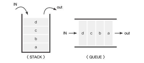 우선 스택stack과 큐queue의 개념을 살펴보자. 스택은 출입구가 하나뿐인 깊은 우물 같은 데이터 구조로 최신 데이터가 제일 먼저 나가고, 큐는 양쪽 모두 열려있는 파이프와 같은 구조로 먼저 들어간 데이터가 제일 먼저 나온다.
