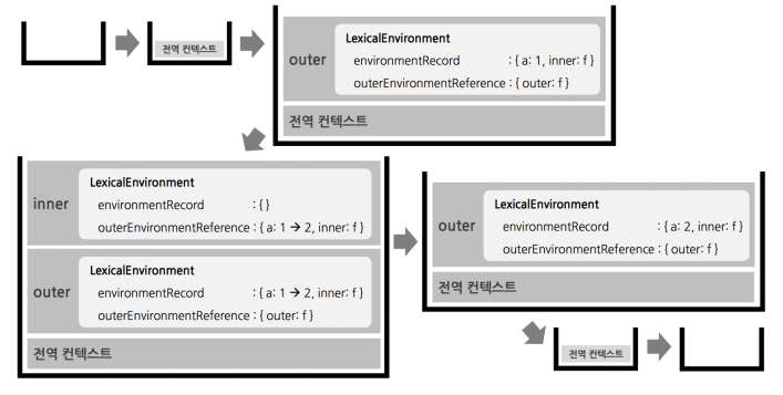 outer 함수에서 변수 a를 선언했고, outer의 내부함수인 inner 함수에서 a의 값을 1만큼 증가시킨 다음 출력한다. inner 함수 내부에서는 a를 선언하지 않았기 때문에 environmentRecord에서 값을 찾지 못하므로 outerEnvironmentReference에 지정된 상위 컨텍스트인 outer의 LexicalEnvironment에 접근해서 다시 a를 찾는다. 4번째줄에서는 2가 출력된다. outer함수의 실행 컨텍스트가 종료되면 LexicalEnvironment에 저장된 식별자들(a, inner)에 대한 참조를 지운다. 그러면 각 주소에 저장돼 있던 값들은 자신을 참조하는 변수가 하나도 없게 되므로 가비지 컬렉터의 수집 대상이 될 것이다.